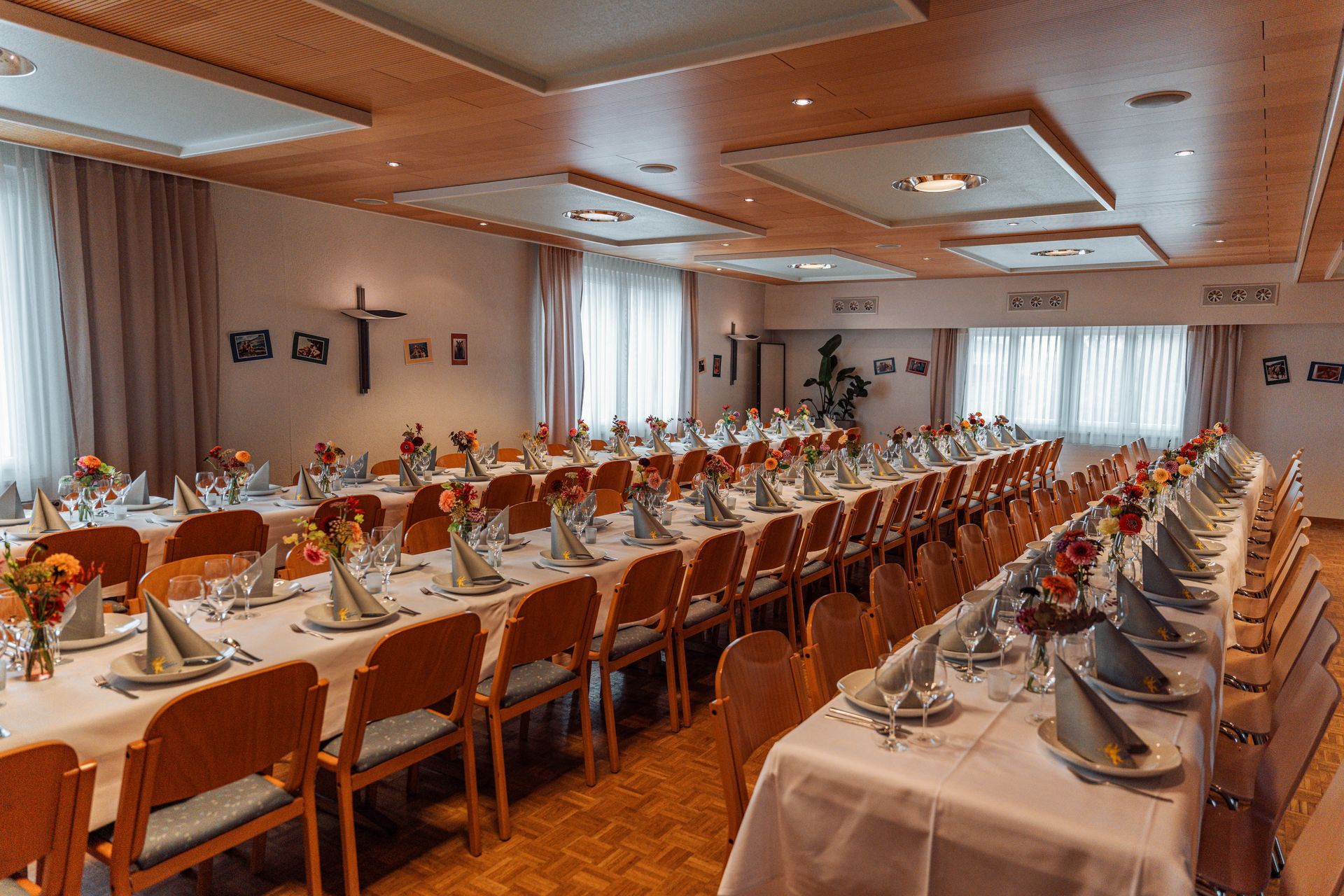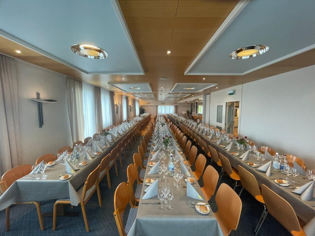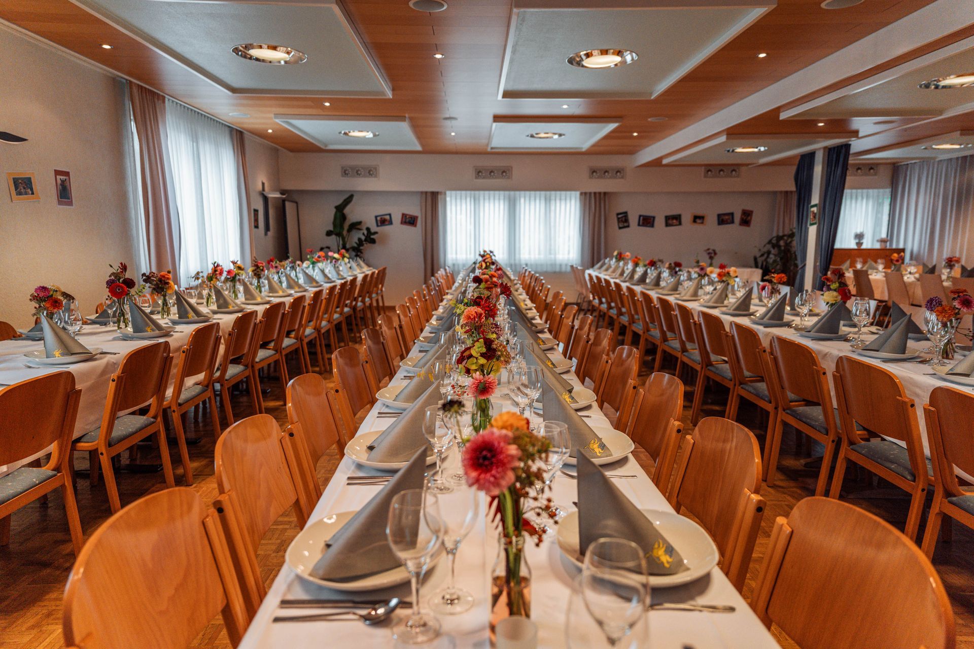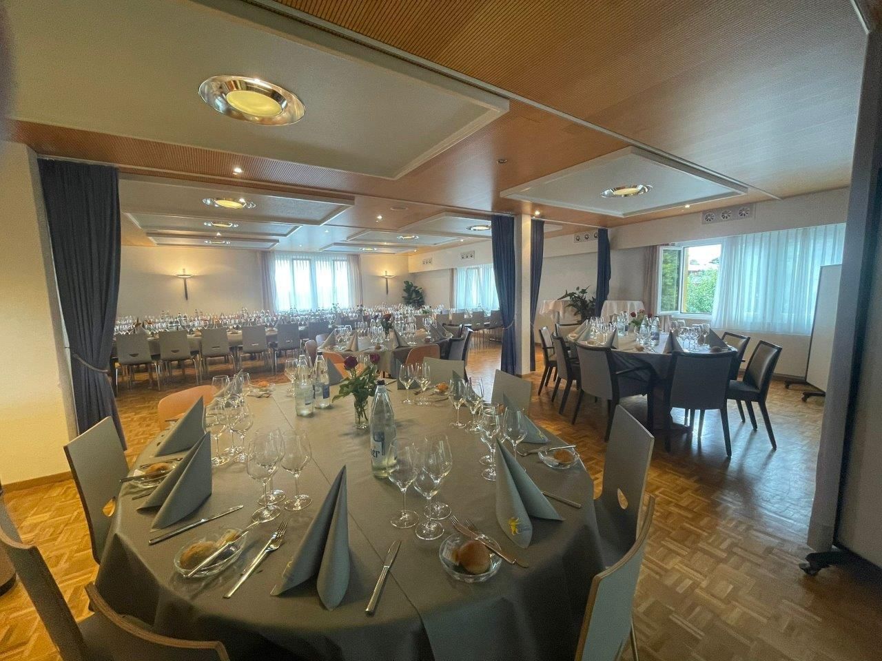 Unser großer Saal, mit Platz für bis zu 120 Gäste, ist ideal für größere Feiern und Bankette und lässt sich flexibel für verschiedene Anlässe gestalten. Mit seiner ansprechenden Atmosphäre und modernen Ausstattung bietet er Raum für festliche Dekorationen und individuelle Gestaltungsmöglichkeiten, die Ihre Feier unvergesslich machen.